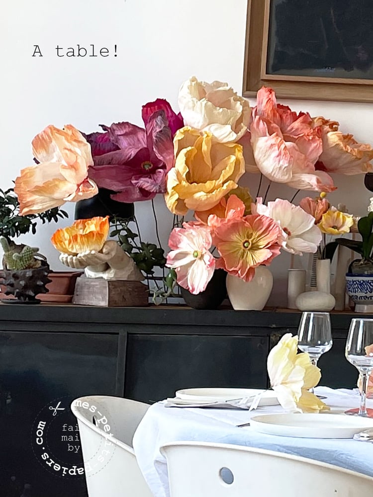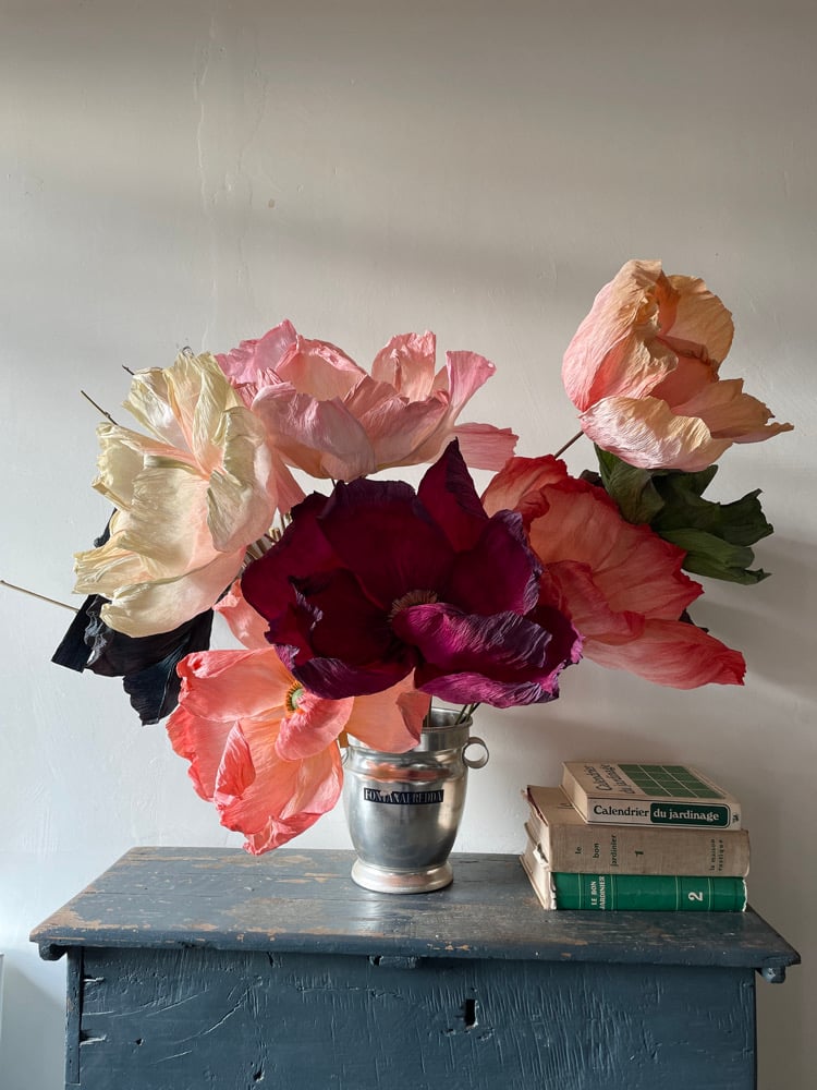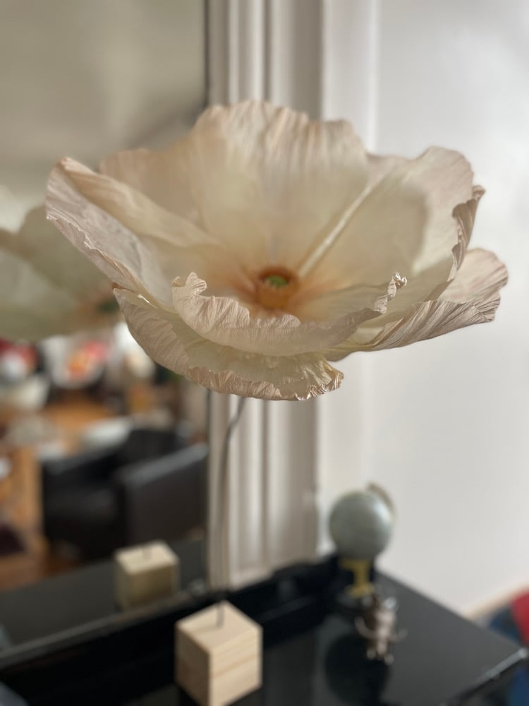 La tige est amovible et chaque fleur possède un petit anneau qui permet, la tige retirée de l’accrocher au mur. Comme un tableau.