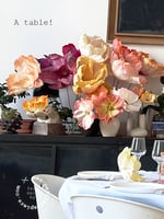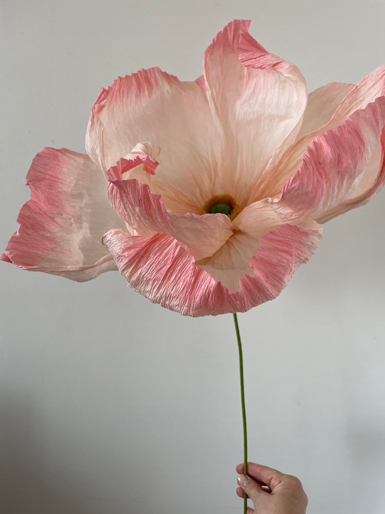 Les dimensions indicatives (varient d’une fleur à une autre) sont les suivantes: mini 40 cm de diamètre, 20 cm de hauteur. Hauteur totale avec tige environ 80 cm.