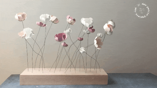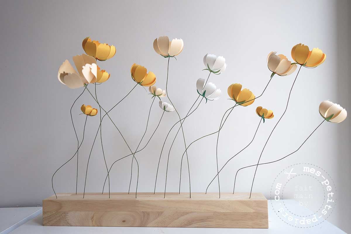 Petites fleurs en papier réalisées à la main, dans mon atelier. Montées sur une fine tige de fer gainée de papier.