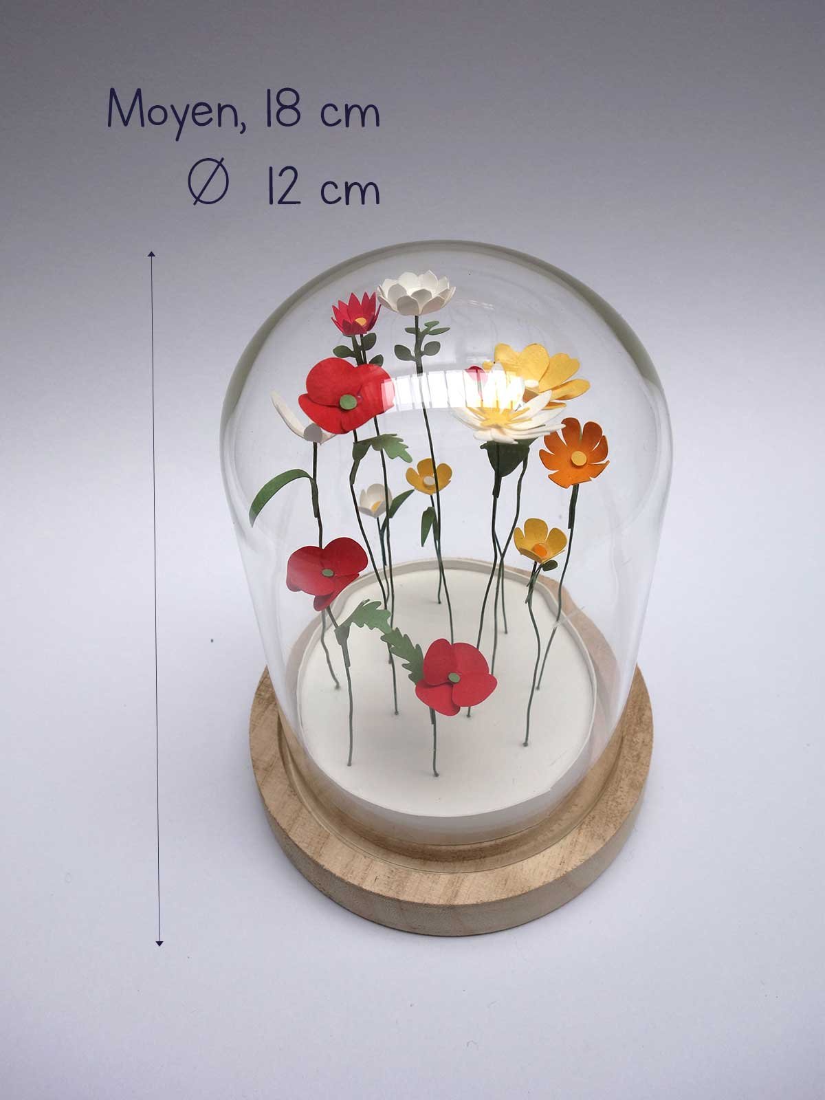 Des petites fleurs en papier, légères et virevoltantes, s'épanouissent sous une petite cloche.